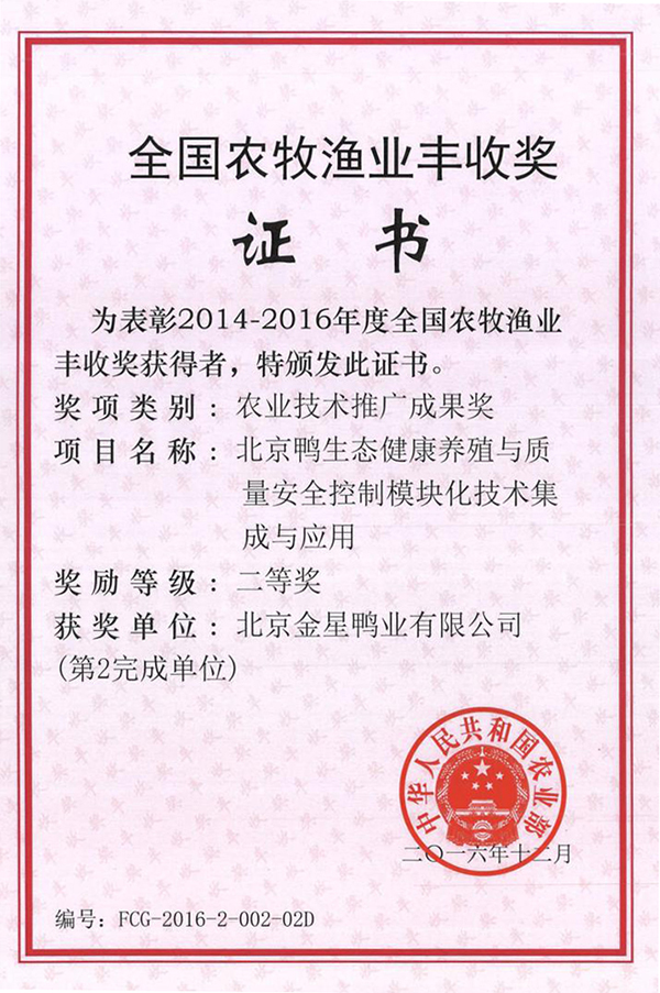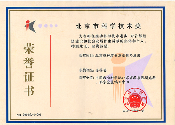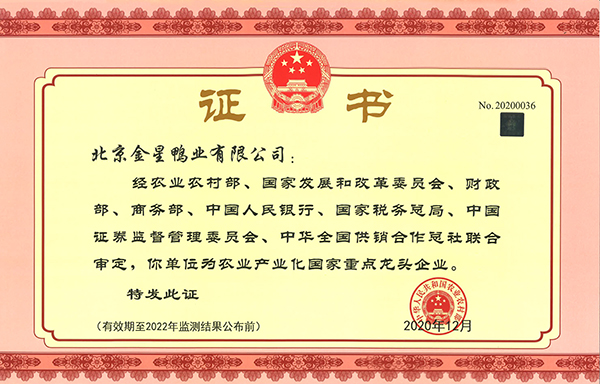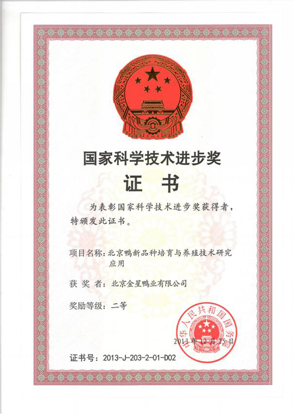 經(jīng)過二十余年的發(fā)展,北京金星鴨業(yè)有限公司的社會影響力愈來愈高,通過了ISO9001質(zhì)量管理體系、ISO22000食品安全管理體系、ISO14000環(huán)境體系等認(rèn)證,并獲得了北京市模范集體、國家科學(xué)技術(shù)進(jìn)步二等獎、北京市科技進(jìn)步一等獎、全國農(nóng)業(yè)標(biāo)準(zhǔn)化示范農(nóng)場、北京市農(nóng)業(yè)產(chǎn)業(yè)化重點(diǎn)龍頭企業(yè)、農(nóng)業(yè)產(chǎn)業(yè)化國家重點(diǎn)龍頭企業(yè)、國家高新技術(shù)企業(yè)、北京鴨地理標(biāo)志產(chǎn)品首家授權(quán)使用單位等多項(xiàng)榮譽(yù)。