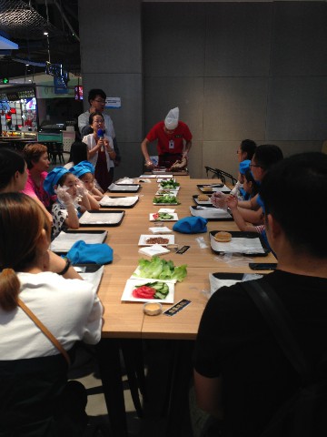 小朋友們在片鴨師的現(xiàn)場指導以及爸爸媽媽的協(xié)助下,親自動手,做金星烤鴨漢堡??绝啙h堡制作完成后,小朋友們還意猶未盡,在工作人員的帶領(lǐng)下,參觀了金星烤鴨店,進一步了解烤鴨文化,并合影留念。