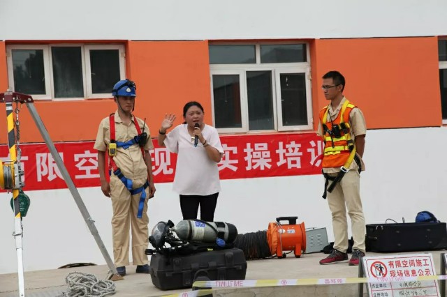 最后,在有限空間培訓現場,北京市勞動保護科學研究所的秦妍老師針對有限空間現場監(jiān)督、檢測、通風、防護以及搶險救援等方面,開展了現場演示和授課。大家頭頂烈日,認真聆聽,秩序井然。
